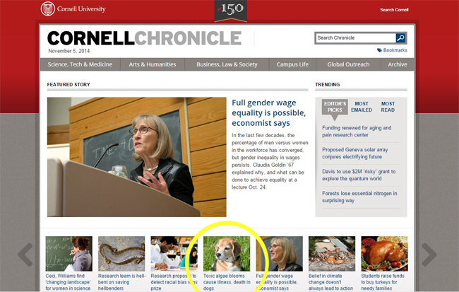 The front page of the Cornell Chronicle on November 5, 2014 included a feature on New York Sea Grant's "Harmful Algal Blooms and Dogs" education campaign.