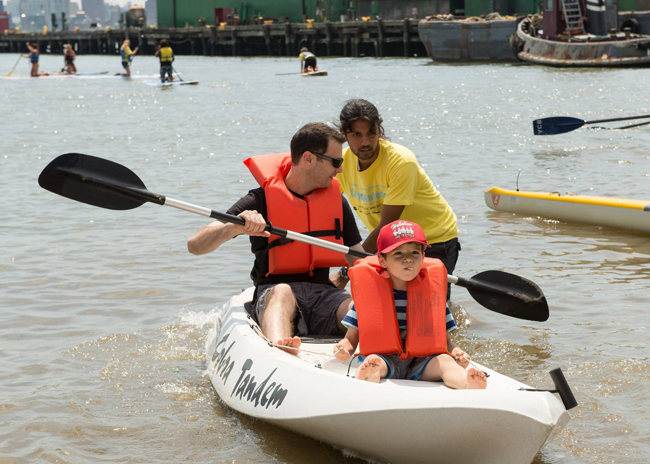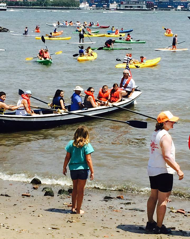 Thousands ventured onto beaches (like this one in Hoboken, NJ), piers and docks for free boat tours, free ferries, free kayaking and free fishing. More than 450 volunteers ensured the day went smoothly. This was the first time that the City of Hoboken participated in the festival’s seven year history. The event was staged at the beach at Maxwell Place Park, also the location of the Hoboken Cove Boathouse. Offerings at the beach included paddle boarding, outriggers, kayaking, and rowing.