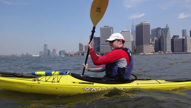 Kayakers in the Hudson River with NYC's financial district as their backdrop.