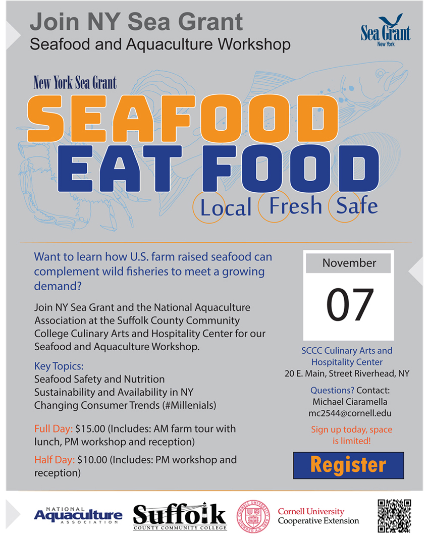 "Our aim with this workshop is to increase knowledge and awareness of the safety and sustainability of local and U.S. farmed seafood and how it can complement wild fisheries," says NYSG Seafood Safety and Technology Specialist Michael Ciaramella.