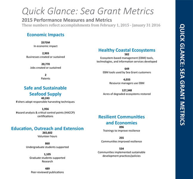 To learn more about why Sea Grant is a smart investment in our nation's coastal economy, check out NOAA Sea Grant's two-page fact sheet (pdf) as well as its nationwide "By The Numbers" one-page stats sheet (pdf) ...